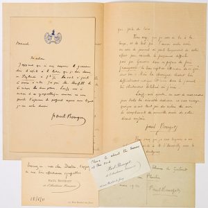 Paul BOURGET, Écrivain, Acad. Fce (Amiens (Somme) 1852 - 1935). 5 Pièces (2 Lettres autographes signées, Carte Postale signés et 2 Cartes de visites.)