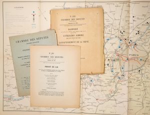 ─ 6 Plans en annexes : (1 Plan des environs de Paris avec indication des égouts, voieries et prises d’eau. 2 Plan des Collecteurs de Paris. 3 Plan de l’envasement du lit de la Seine. 4 Plan des irrigations de Gennevilliers avec indication des conduites, bouches et distribution et drains. 5 Plan des irrigations projetées à Achères. 6 Sondages dans la Forêt de Saint-germain. Plan et coupes.)
