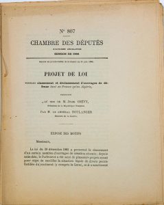 Président de la République Française, par M. le Général BOULANGER Ministre de la guerre. » - Imprimé N°807, 99 pages in-4°.