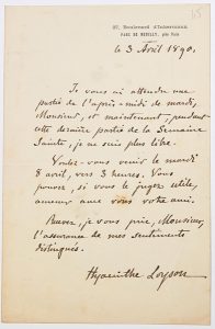 Père HYACINTHE (LOYSON Charles dit) Prédicateur & Théologien français (Orléans 1827-1912) - Lettre Autogr. Signée Hyacinthe LOYSON, le 3 Avril 1890 – 1p in-8°, à l’en-tête de son adresse 27 bd Inkerman Parc de Neuilly, près Paris –...
