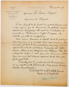 Édouard DETAILLE, Peintre, de l’Académie des beaux-Arts. (1848 – 1912) Lettre signée, en bleu, en tant que Président des Artistes Français, Membre de l’Institut. Palais des Champs-Élysées Décembre 1897. A Mr LE SENNE, Député. 1p...