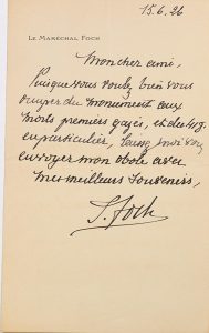 Ferdinand FOCH, Maréchal de France (1851 – 1929) – L.A.S., En-tête imprimé « Le Maréchal FOCH » - du 15 juin 1926 – Le Vieux Maréchal n’oublie pas ses Compagnons d’armes tombés au cours des combats de la première Guerre Mondiale :