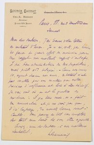 « Mon cher Docteur. J’ai trouvé votre lettre en rentrant d’Evian. Je n’ai certes, pas besoin de faire de grands efforts de mémoire pour me rappeler nos excellents rapports d’autrefois. Je suis bien administrateur du MÉTROPOLITAIN, mais point administrateur délégué. Comme nous sommes 10, ayant chacun nos amis, ce détail n’est pas inutile pour vous montrer que notre dixième d’influence est loin d’être décisif. Je vais voir où en est la question des médecins : il y a trois mois, on a fait des nominations et je ne crois pas que d’ici longtemps, de nouvelles lacunes soient à combler… » -