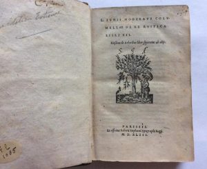 COLUMELLA, Lucius Iunius Moderatus. De Re Rustica libri XII. Paris, Robert Estienne, 1543. In-8, 498 pages, (10 ff).