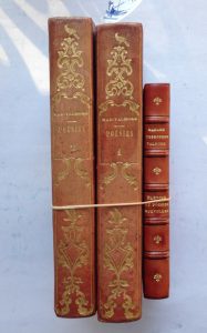 DESBORDES-VALMORE, Marceline. Poésies de Madame Desbordes Valmore. Paris, Bouland, 1830. 2 volumes in-8, 1/2 veau rouge du temps, dos sans nerf orné de fers rocaille. (Dos légèrement passé).