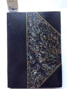 Dos sans nerfs, avec trois rectangles composés d'un triple filet droit doré ; motif mosaïqué de chardon.