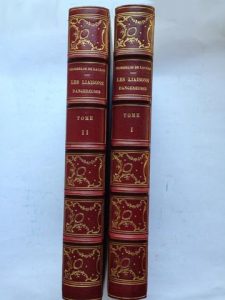 LACLOS, Pierre Ambroise CHODERLOS de. Les Liaisons dangereuses. Eaux-fortes originales de Janniot. Paris, Carteret, 1914-1918. 2 volumes in-4°. 1/2 maroquin bordeaux à coins , dos à 5 nerfs orné dans le goût du XVIIIème siècle.