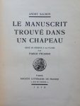 SALMON, André. Le Manuscrit trouvé dans un chapeau. Orné de dessins à la plume par Pablo Picasso. Paris, Société Littéraire de France, 1919. Grand in-8 (270 X 200 mm), 115 pages et (2 ff).
