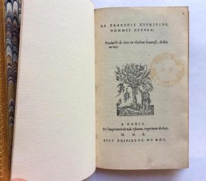 EURIPIDE. La Tragédie d'Euripide nommée Hecuba, traduicte de grec en rhythme françoise, dédiée au Roy. Paris, Robert Estienne, 1550. In-8, 104 pages.
