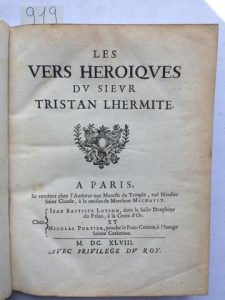 TRISTAN L'HERMITE, François. Les Vers héroïques du Sieur Tristan Lhermite. A Paris, se vendent chez l'Autheur aux Marests du Temple, rue Neufve St Claude, à la maison de Monsieur Michault. Paris. Chez J.B. Loyson, et chez Nicolas Portier. 1648...