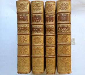 Il a été commandé à Vertot (1655-1735) par l'Ordre lui-même, et demeure l'ouvrage de base sur le sujet. Portrait de l'auteur en frontispice, 70 portraits blasonnés hors-texte inscrits dans un médaillon, 6 cartes et plns dépliants hors-texte.