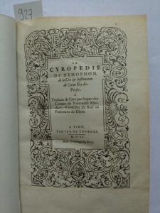 XENOPHON. La Cyropédie de Xénophon, de la Vie et Institucion de Cyrus, Roy des Perses. Traduite du Grec par Iaques des Comtes de Vintimille, Rhodien. A Lion, par Ian de Tournes. 1555. In-4°, (12 ff), 248 pages, (4 ff).