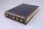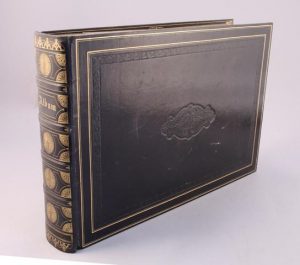 MPORTANTE RELIURE d'ALBUM en cuir/chagrin ? de couleur aubergine finement ouvragé de fers à l'or fin. Nombreux feuillets intercallés de papier de soie. Housse et son boîtage de protection. XIXème. 49 x 34 x 9 cm.