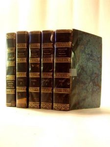 manque de cuir au au dos du tome I et du tome II, plats détachés aux tomes IV & V, quelques rousseurs, mais remarquables provenances :