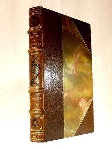Relié avec un dos à faux-nerfs, caissons ornés de dorures, de fers à froid et d'une incrustation au chardon, tête dorée, couverture originale illustrée conservée, belles marges.