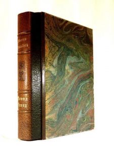 Reliure sous emboitage et étui, pastiche Renaissance plein maroquin à ornements à froid, encadrements sur les plats et dorures en écoinçons, tête dorée, gardes de satin.