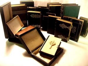In-16 rel. ivoire avec composition centrale, tranches bleutées avec semis d'étoiles dorées, fermoir argenté, gardes moirées, boite de rangement.