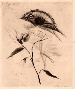 APOUX (Joseph). Le Papillon. Vers 1890. Eau-forte tirée sur vergé. 21 x 18 cm. Épreuve signée par Joseph Appux (1846-1910) dans la plaque, éditée par R. Pincebourde, certainement pour les Rêveries fantastiques.
