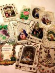 [CANIVETS RELIGIEUX]. Ensemble composé d'une planche, d'un album et d'une boite, le tout contenant environ 30 canivets mécaniques XIXe, la plupart à sujet colorié. Etats divers.