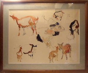 COMMÈRE (Jean Yves). Bucoliques. Grande composition animalière à l'encre et aquarellé, encadrée sous marquise, signée et titrée en bas à droite, 74 x 55 cm (cadre 73 x 93 cm).