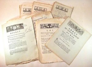 [DÉCRETS RÉVOLUTIONNAIRES]. Lot de 7 décrets imprimés au Mans par divers imprimeurs : prohibition de sortie du Tarn, procès en déclaration de paternité, entrées des militaires dans les hôpitaux, condamnation des contre-révolutionnaires,...