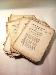 [DÉCRETS RÉVOLUTIONNAIRES]. Ensemble d'une cinquantaine de décrets de la Convention nationale imprimés à Coutances et au Mans, quelques-uns avec signature autographe des administrateurs des districts (Marmion à Cherbourg, Hervé à...