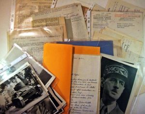 Une vingtaine de photographies et photogravures du Général de Gaulle, 4 photographies de char d'assaut, un dossier de mise sous scellés d'un appartement à Paris en tant que « propriété juive » (juin 1944), plusieurs tapuscrits et manuscrits liés au Rassemblement du peuple français, tapuscrit d'un discours politique de Malraux, papiers de la 4ème division Marocain, ordre de mouvement de juin 1940, documents sur des prisonniers de guerre, document secret sur les liaisons téléphoniques, un manuscrit de désertion (guerre 14-18), etc.