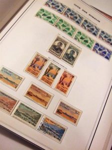 [PHILATÉLIE]. Lot de 4 albums de timbres rouge, noir et vert réunissant une collections de timbres neufs et oblitérés, de blocs, d'entiers postaux, dont côte des Somalis, Belgique années 40 dont dentellé au profit de la chapelle musicale de...