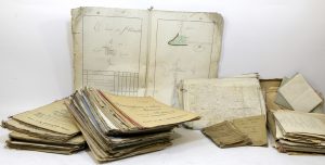 Un « plan géométrique » des biens appartenant aux Fortier-Imbault sur les terroirs de Gouvernes et St-Thibault dressé en 1819 et comportant 15 plans cadastraux à l’encre et à l’aquarelle (état moyen)