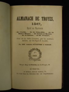 [ALMANACHS].— GADAN, AUFAUVRE (Amédée). Almanach de Troyes, 1847 [-1848], spécial aux départements de l’Aube, de la Côte-d’Or, de la Haute-Marne, de la Marne, et de l’Yonne. Troyes, Poignée, 1847-1848 ; 2 vol. in-12, demi-chagrin...