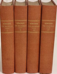 BARRAS. Mémoires de Barras membre du Directoire. Publié avec une introduction générale, des Préfaces et des Appendices par Georges Duruy. Paris, Librairie hachette, 1895-1896 ; 4 forts vol. in-8, toile orangée, dos lisse, titre et tomaison...