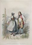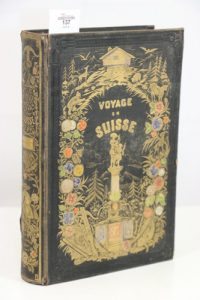 Exemplaire revêtu du cartonnage romantique de l'éditeur, peu commun, illustré de compositions qui empruntent des éléments à l'imagerie classique de la Suisse : Guillaume Tell sur un piédestal, des arbalètes, des chalets en rondins, une bergère…