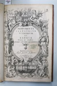 BOXHORN (Marcus Zuerius). Monumenta illustrium virorum et elogia. Cura ac studio Marci Zuerii Boxhornii. Amsterdam, Joannem Janssonium, 1638 ; pet. in-folio, basane caramel, encadrement d’un filet doré sur les plats, dos à nerfs orné de motifs...