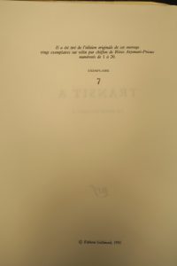 papier vélin pur fil de Lafuma-Navarre, seul grand papier après 20 Hollande ; le second, l’un des 20 exemplaires numérotés (n° 7) sur papier vélin de Rives, seul grand papier