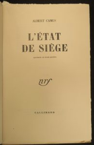CAMUS (Albert). L'État de siège. Spectacle en trois parties. Paris, Gallimard, 1948 ; in-12, broché, non coupé. Édition originale. Exemplaire hors commerce sur papier vélin Alfa de Navarre. Très bon exemplaire