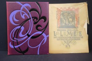• BAUDELAIRE (Charles). Les Fleurs du mal. Paris, Club du Livre, 1985; in-4, maroquin aubergine, large décor d’entrelacs noirs et mauves sur les plats, dos lisse orné du titre en long en mauve, tête dorée, [rel. de l'éditeur], dos passé.