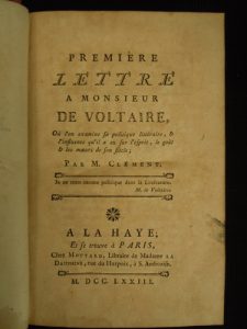 CLÉMENT (Jean Marie Bernard). Première [.— Cinquième] Lettre à Monsieur de Voltaire. La Haye, Paris, Moutard, 1773-1774 ; 5 titres reliés en un vol. in-8, basane marbrée, dos à nerfs orné de motifs dorés, pièce de titre rouge sombre,...