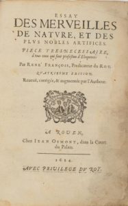 Ouvrage célèbre qui connut plus de 20 éditions au XVII° siècle ; il est orné de figures dans le texte et a été écrit sous le pseudonyme de René François. Le titre gravé (avec manque) est daté de 1622. Exemplaire en condition modeste. (Thiéb., 94) (Souhart, 51).