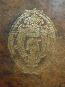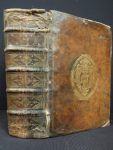l’origine de toutes les religions et de tous les chevaliers et ordres militaires. Rouen, Jacques Cailloüé, 1644 ; in-8 (22,6 x 16 cm), veau brun olivâtre, plats ornés d’un filet à l’ancienne doré ainsi que d’un large emblème représentant un cœur transpercé d’une flèche dans un encadrement agrémenté de têtes d’angelots, lui-même encerclé par des palmes, dos à nerfs décoré de motifs dorés, tranches dorées, [rel. de l'époque], épidermures et qqs déchirures sur les plats et le dos, coins et chants émoussés, tranchefile sup. fragilisée.