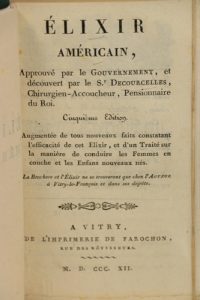 DECOURCELLE (Gilles Joseph). Élixir américain approuvé par le Gouvernement, et découvert par le Sr Decourcelles, chirurgien-accoucheur, pensionnaire du Roi. 5e édition augmentée de tous nouveaux faits constatant l'efficacité de cet élixir, et...