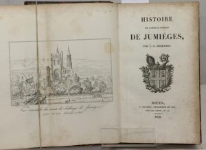 DESHAYES (C.-A.). Histoire de l'abbaye royale de Jumièges. Rouen, F. Baudry, 1829 ; in-8, demi-veau blond, dos lisse orné de filets dorés et à froid, pièce de titre noire, [rel. de l'époque]. [4] ff., VI, 288 p., [1] f. d'errata, 5 planches...