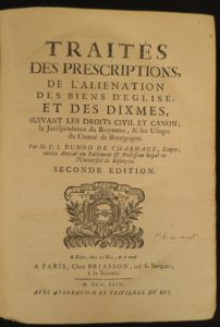 DUNOD DE CHARNAGE (M. F. I.). Traités des Prescriptions, de l'aliénation des biens d'église, et des dixmes, suivant les droits civil et canon, la Jurisprudence du Royaume, & les Usages du Comté de Bourgogne. Dijon, de Fay, Paris, Briasson,...