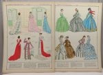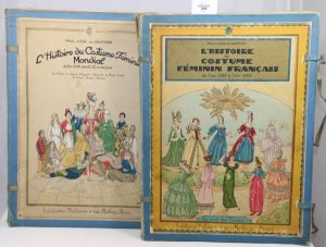 • L'Histoire du costume féminin français de l'an 1037 à l'an 1870 ; 9 fasc. réunis sous la même chemise gris-bleu, couv. illustr., 108 pl. de costumes en couleurs au total.