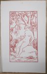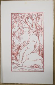 à 400 exemplaires numérotés sur papier vergé de chanvre et lin. L’un des 50 exemplaires numérotés en chiffres romains (n° XLIV), accompagnés d’une suite en sanguine et d’une suite en noir des bois (les suites semblent ne pas avoir le même nombre de figures que le texte).