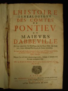 IGNACE (père). L’Histoire généalogique des comtes de Pontieu et majeurs d’Abbeville. Paris, François Clouzier, 1657 ; pet. in-folio, veau granité, dos à nerfs orné de motifs dorés, tranches jaspées, [rel. de la fin du XVIIe s.], coiffes...