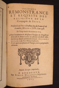 [JÉSUITES]. Très-humble remonstrance et requeste des religieux de la Compagnie de Jesus. Bordeaux, Simon Millanges, 1603 ; in-12, basane granitée, filet doré en encadrement sur les plats, dos à nerfs orné de motifs dorés, [rel. de l'époque],...