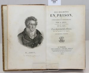 JOUY (Etienne de) et JAY (A.). Les Hermites en prison ou consolations de Sainte-Pélagie, par E. Jouy, membre de l'institut, et A. Jay. Ornés du portrait des Auteurs et de deux gravures et six vignettes. Paris, Ladvocat, 1823 ; 2 parties en un vol....