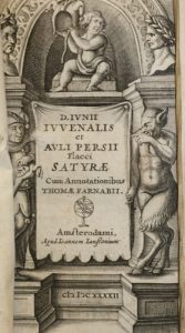 JUVENAL & PERSE. Satyrae, cum annotationibus Thomae Farnabii. Amsterodami, Johannem Jansonnium, 1642 ; in-16, parchemin souple, dos long muet, [Rel. moderne], dos rapporté. 189 p., titre-frontispice gravé sur cuivre. Exemplaire un peu court de...