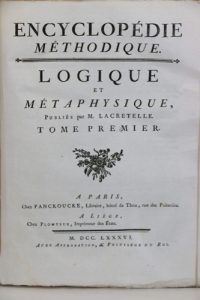 LACRETELLE (Pierre-Louis). Encyclopédie méthodique. Logique et métaphysique. [Et morale]. Paris, Panckoucke, 1786-1791 ; 4 tomes en 8 volumes in-4, cartonnage ancien modeste. Suite complète des volumes consacrés à la logique, la métaphysique...