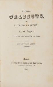 Deyeux (Th.). Le Vieux Chasseur ou la chasse en action. Avec 55 gravures dessinées par Forest. Edition Vade Mecum. Paris, Houdaille, 1837. In-18 de 178 pages, peau de sanglier, titre à froid sur le plat, couvertures illustrées conservées